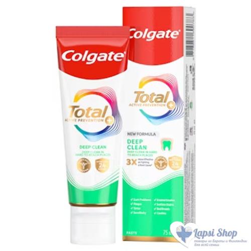 Colgate Total Deep Clean — зубная паста с микрогранулами, разработанная для глубокой очистки полости рта. Обеспечивает всестороннюю 24-часовую защиту от бактерий при регулярном использовании. Микрогранулы проникают в труднодоступные зоны, эффективно удаляют налёт и способствуют улучшению здоровья дёсен. Освежает дыхание и укрепляет зубную эмаль.